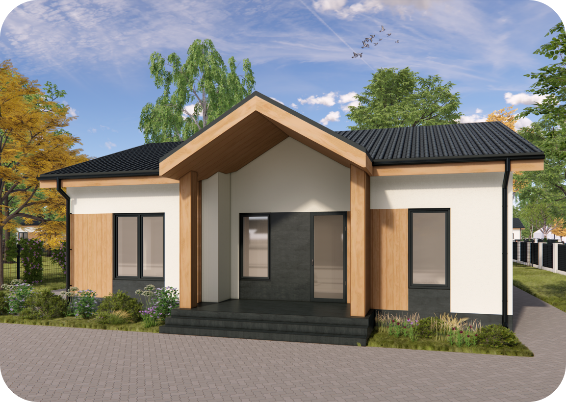 Компактный дом 85 кв. м. с двускатной крышей имеет продуманную планировку с раздельными общественной и приватной зоной, а так же большую террасу в базовом исполнении.